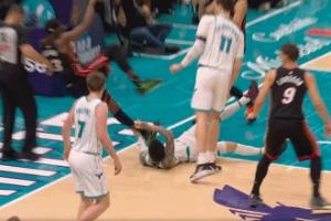 GIF-这动作不好!三球用手扒阿德巴约脚后跟致其倒地受伤,已回更衣室!