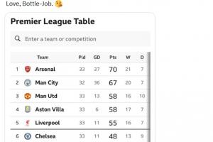 摩根:“所以,阿森纳依旧稳居榜首,依然将赢得联赛冠军。曼城还是第二,曼联依然无关紧要;利物浦还是实力只剩去年一半;切尔西依旧一无是处;热刺依然迟早降级。